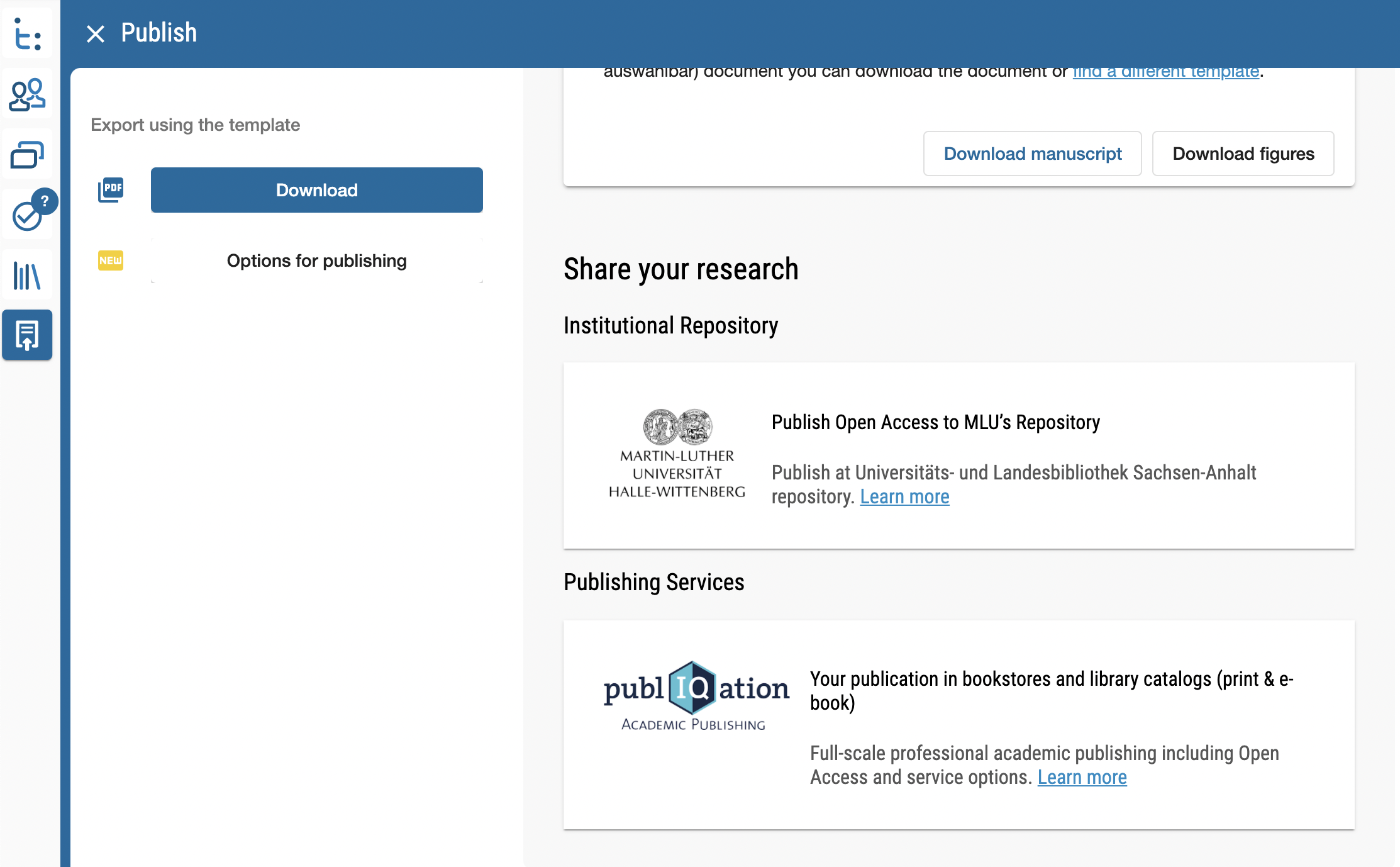 Zunächst wird die Dissertation wie gewohnt in SciFlow geschrieben, Referenzen eingefügt, die Rechtschreibung geprüft, gegengelesen und finalisiert. Mit einem einfachen Klick auf „Options for Publishing“ werden dann alle verfügbaren Optionen zur Veröffentlichung Ihrer Dissertation angezeigt - darunter auch PubliQation.