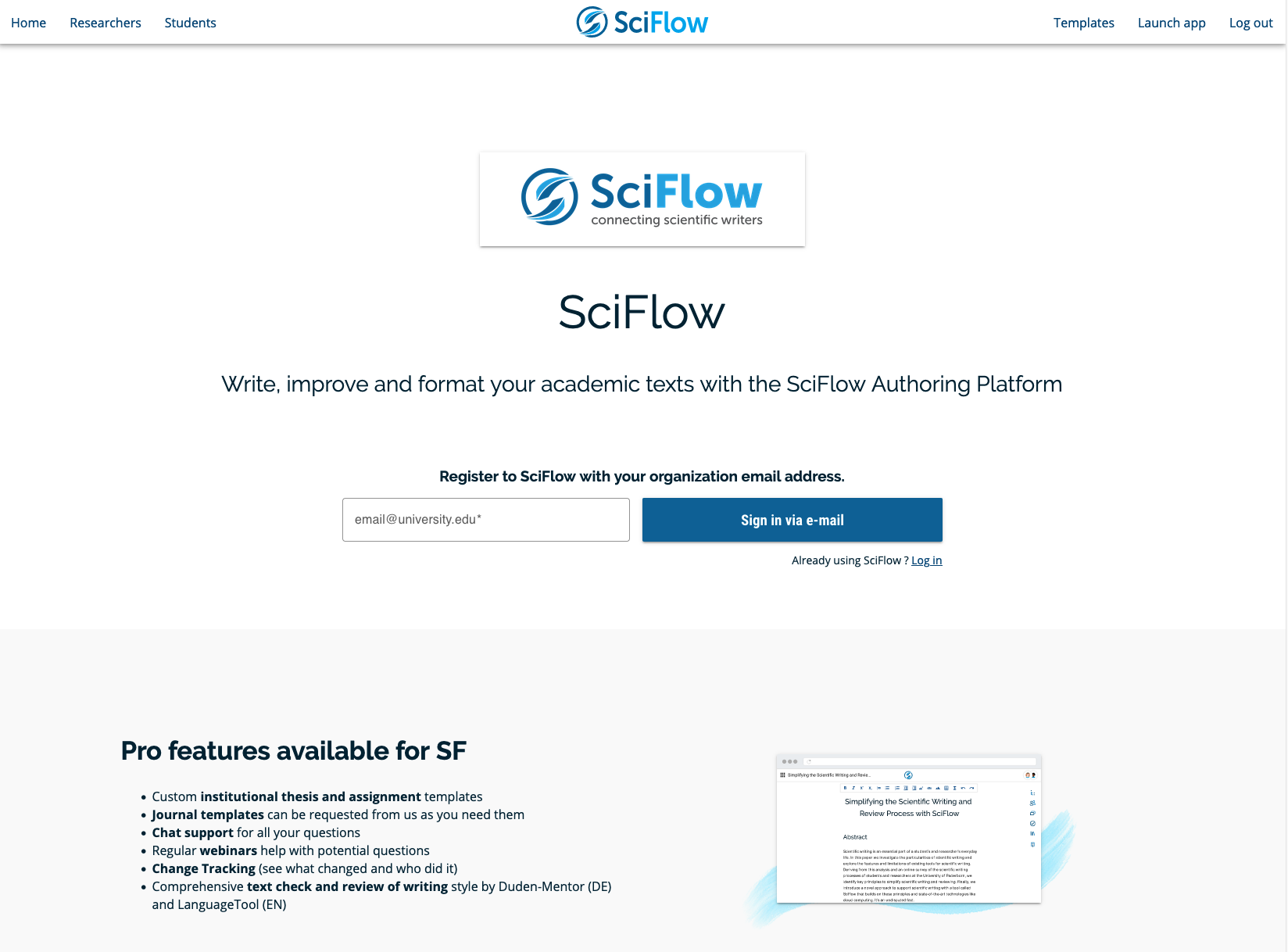 Der beste Weg zur Registrierung führt Ihre Studierenden und Forschenden über Ihre individuelle Portalseite. Dort finden sich grundlegende Informationen zur Nutzung von SciFlow, Ankündigungen neuer Funktionen, Webinartermine und die Möglichkeit zur Registrierung. Sollten Sie die URL zu Ihrer Portalseite nicht zur Hand haben, kontaktieren Sie uns gerne. User können sich andernfalls auch jederzeit überall auf unserer Webseite anmelden.
