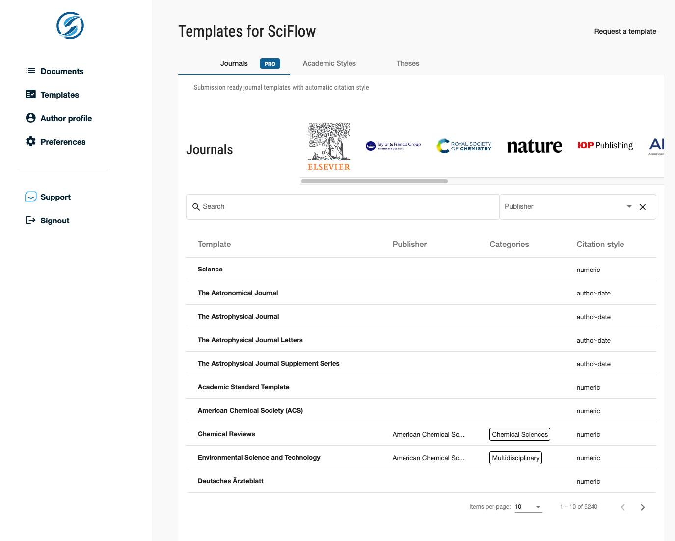 Ihre Forschenden finden in der Journal-Datenbank tausende einreichungsfähige Templates für Journals aller großen Verlage, sobald sie sich bei SciFlow angemeldet haben. Die erforderliche Formatierung und der richtige Zitierstil werden beim Export des Dokuments automatisch angewendet.